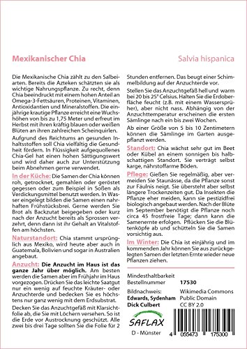 SAFLAX – Geschenk – Set – Kräuter – Mexikanische Chia (Salvia hispanica) – 500 Samen – Mit Geschenk- und Versandbox, Geschenkkarte, Anzuchtsubstrat und Versandaufkleber – Aufgrund der technischen Begrenzung von amazon können wir hier leider nicht unsere ausführlichen Informationen darstellen. Bei den Bildern zum Artikel finden Sie aber eine Abbildung der Rückseite unserer Samenkarte mit allen Texten.Bildnachweis:Nachfolgende Bildnachweise in der Darstellungsreihenfolge von oben nach unten bzw. von rechts nach links in der Lightbox.Amazon gestattet keine direkten Links. Die Links zu den einzelnen Lizenzen werden daher als Text angegeben.47530-32-31-salvia-hispanica – Edwards, Sydenham – Public domain – http://creativecommons.org/licenses/publicdomain/12403-Geschenkkarton-Sticker-Postkarte-Kokossack-und-Text.jpg – © Saflax – – 17530-K-VS.jpg – © Saflax – – 17530-K-RS.jpg – © Saflax – – – – – – – – – – – – – – – – –